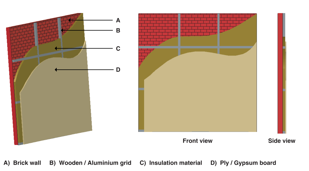 The suggested thickness varies from 50 mm to 75 mm depending on the end requirement and consists of two layers both of which facilitate thermo-acoustic insulation. Isolation layer in the design further enhances the performance. The final layer of insulation in the system can be designed as per user requirement. If the priority is acoustic comfort, the acoustic insulation layer is placed next to the finishing; for example, a home theatre. Similarly, if thermal comfort is the priority, the thermal insulation layer is placed next to the finishing; for example, an office cabin.
