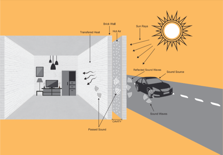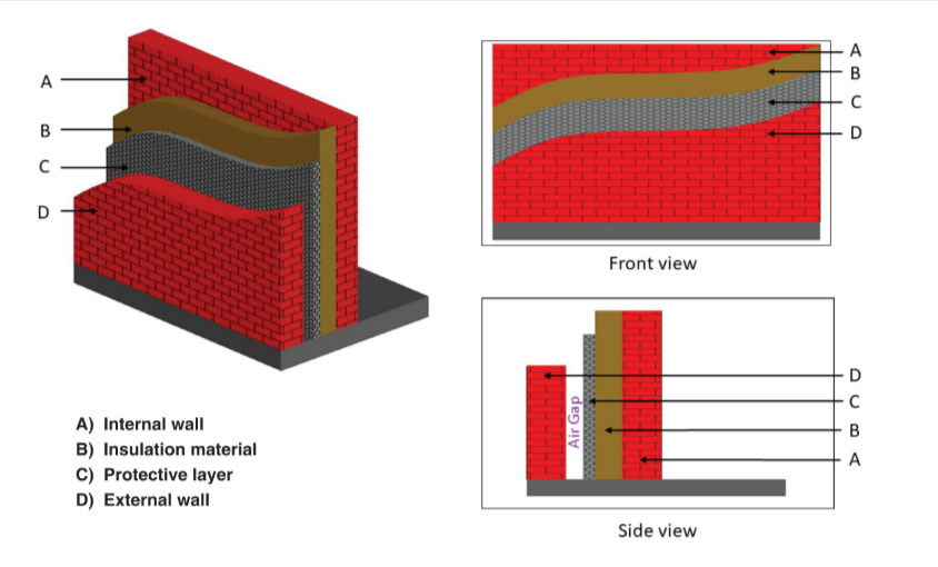 A cavity wall is two layers of masonry with an air gap in between. The air gap is called Cavity. Cavity between two walls is used to overcome the effect of direct conduction through the wall. The air trapped inside the cavity acts as insulation and eliminates direct conductive heat transfer through the wall. But still, transfer of heat by convection cannot be eliminated.