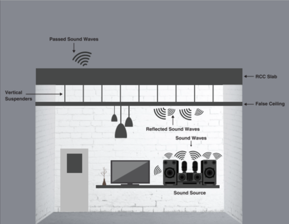 False ceilings can also be created for acoustic purposes along with the usual aesthetic effect. These are basically ceilings with perforation in them or with hollow spaces to let the sound travel. They can also be created to just dampen the sound from the floor above. This is a limited solution, which is incomplete without acoustic insulation pads.