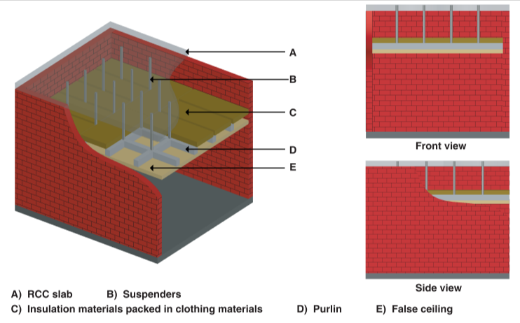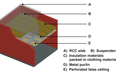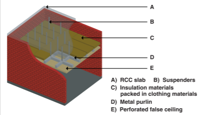 Various combinations of materials can be used on top of the false ceiling layer. These are light in weight and have excellent thermal properties. These materials help Imit the ingress of heated air from the ceiling space to the space below. The suggested thickness here can vary from 25 mm to 100 mm, based on the required thermal resistance. This system can also be designed to suit the cooling requirements of the space.