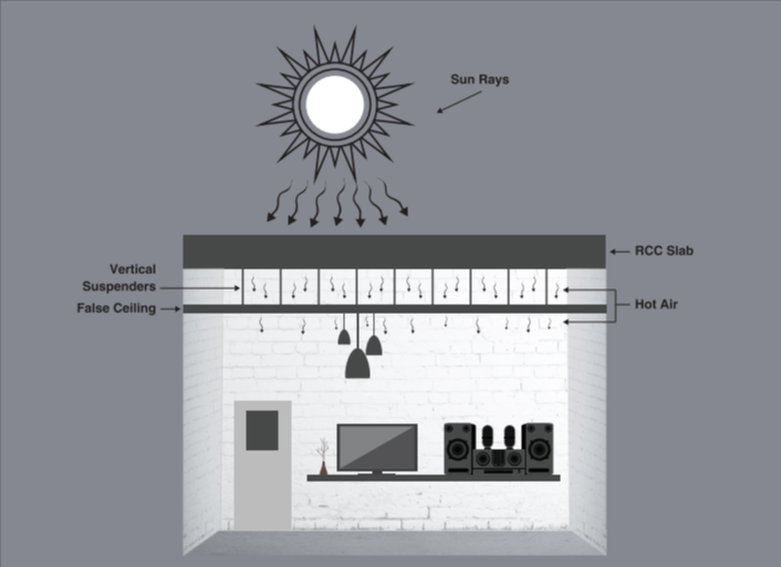 When atmospheric temperature is more than room temperature, heat is transferred from the atmosphere to the inside of the building from the ceiling by convection. Due to this, air trapped between the main ceiling and false ceiling heats up, which transfers to the space below. The metal grid for false ceiling may also transfer heat to the space below. This increases the temperature inside the space below and creates discomfort. Such continuous transfer of heat increases the cooling load requirement and ultimately increases the energy bills.