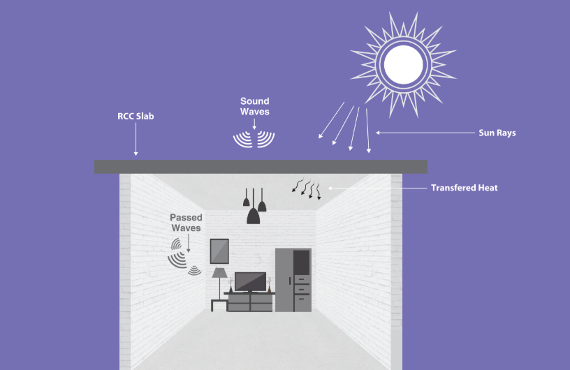 Both heat and sound can get transferred to the floor below through RCC slabs, as it is a good conductor of both. This heat and sound transfer can disturb the occupants in the floor below, especially those areas that come under kitchen or if some pipeline or duct work is happening outside. This requires more energy to maintain comfortable temperature. Impact sound is very difficult to eliminate entirely or reduce as compared to the airborne sound.
