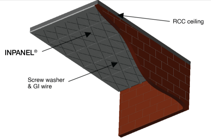 - INPANEL having low thermal conductivity shall be fixed under the RCC ceiling of building to reduce heat gain through the RCC ceiling & helps in maintaining the temperature inside the building.
