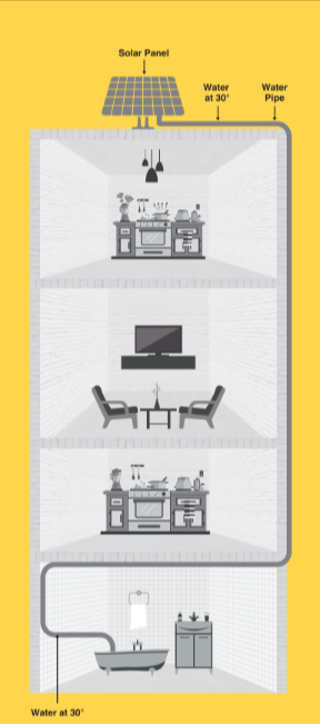 If solar water heater is situated at the top of the building, the top floor might receive hot water but the ground floor may receive a little colder water. Hot water loses its temperature as it flows through the pipe. This is due to the pipe material and atmospheric conditions. Similarly, cold water in the pipes may also lose temperature based on the same factors.